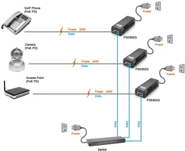 - Tác dụng cấp nguồn vào cho PoE, trộn cả data & power vào chung trong 1 sợi dây cáp mạng RJ45. Dây mạng chuẩn 568A hoặc 568B.