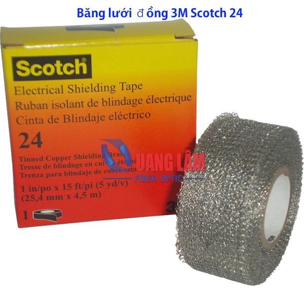 Băng lưới đồng 3M Scotch 24 Scotch này được sử dụng để che chắn bảo vệ điện qua mối nối. Đây là một băng keo chứa kim loại, bằng phẳng, dệt mở, phù hợp, và nhiệt độ ổn định chống ăn mòn không bị ảnh hưởng bởi dung môi, tia cực tím, ozon và độ ẩm