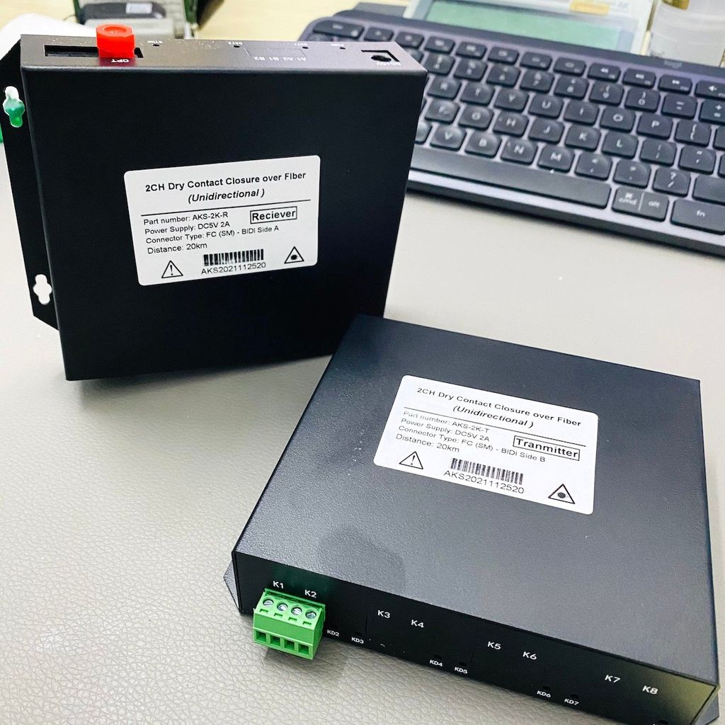 Bộ chuyển đổi 2 kênh công tắc sang quang, 20km, 1 sợi quang, cổng FC (2CH Dry Contact Closure over Fiber), P/N: AKS-2K-T/R (Cặp) - Gồm 1 Cặp: Thu và Phát - Chuyển đổi công tắc đóng mở ON/OFF Dry Contact sang quang - Khoảng cách truyền dẫn quang: 20km - Chuẩn sợi quang: Loại 1 sợi quang, đơn mốt (Singlemode) - Đầu nối quang: Đầu tròn FC - ĐIện áp cấp: DC5V2A - Đã kèm 02 Adapter nguồn kèm theo