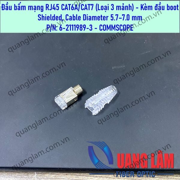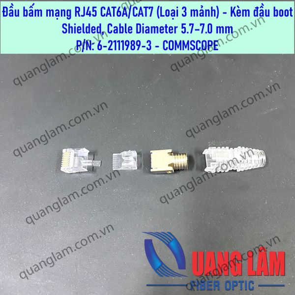 Đầu bấm mạng RJ45 CAT6/CAT6A (Loại 3 mảnh)- Modular Plug, Category 6, Shielded, Cable Diameter 5.7–7.0 mm P/N: 6-2111989 - Kèm đầu boot trong suốt (P/N: 2843033-3) - Dùng cho cáp mạng CAT6A/CAT7 loại chống nhiễu - Kết cấu 3 mảnh ghép lại - Kèm đầu Boot trong suốt cho cáp 5.7-7.0mm P/N: 2843033-3 =========================================================================
