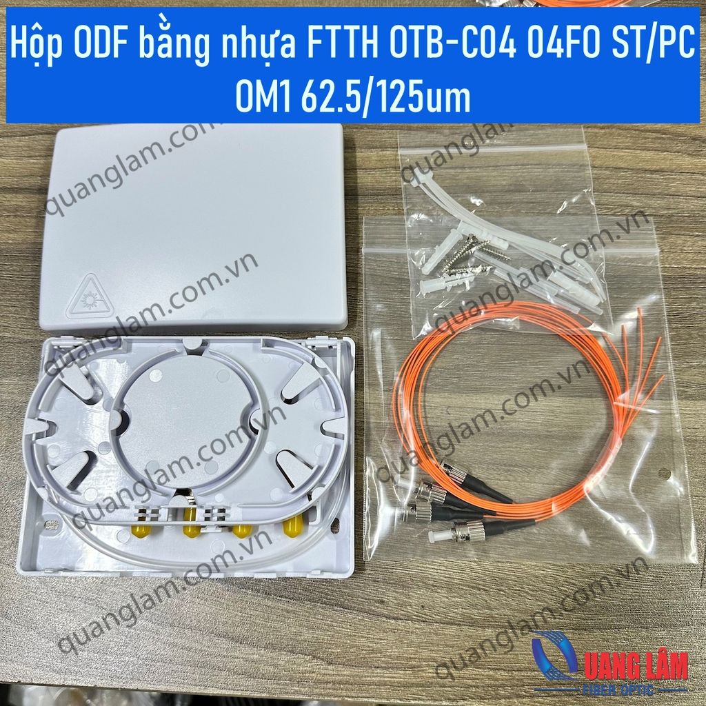 Hộp ODF bằng nhựa FTTH OTB-C04 04FO ST/PC OM1 62.5/125um( 4 Adapter ST, 4 ống co nhiệt, 4 dây nối quang MM OM1 62.5/125um ST/PC dài 1M, phi 0.9mm)