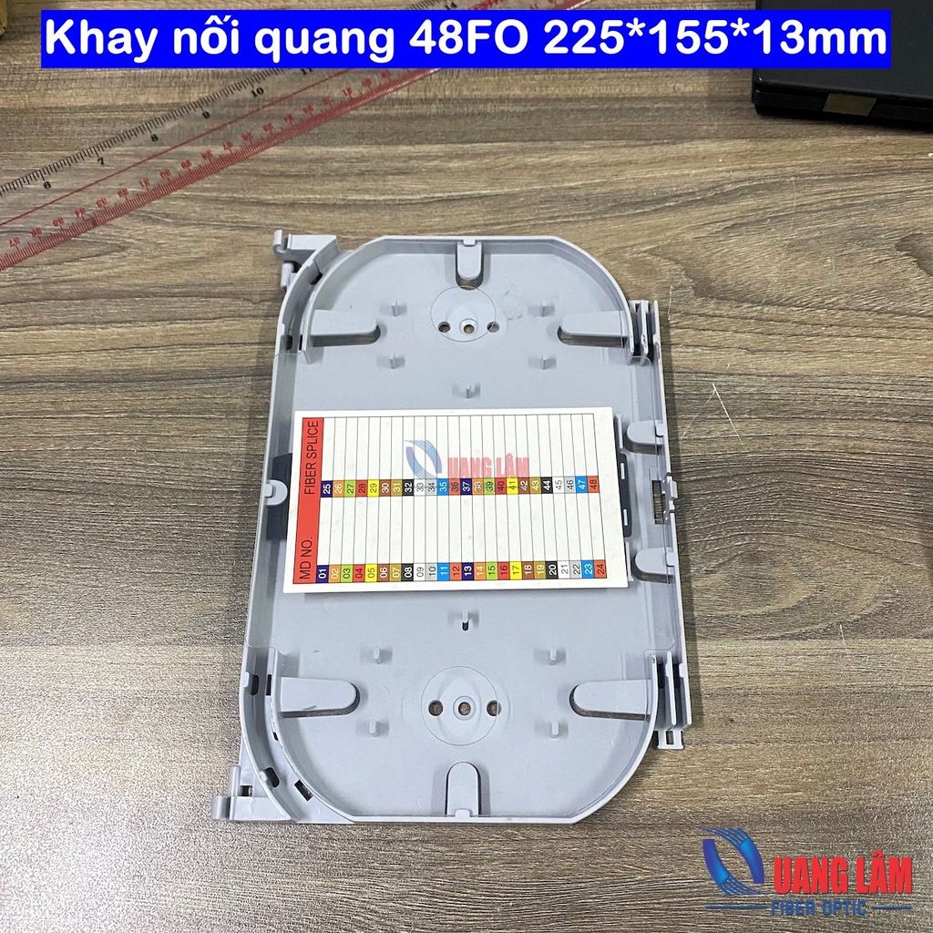 Khay hàn quang 48FO - Kích thước 225x155x13mm - Là khay hàn để quản lý và bảo vệ các mối hàn sợi quang - Mật độ cao lên đến 48 sợi quang, giúp tiết kiệm không gian của hộp ODF - Dùng để bắt vào các ODF, các hộp nối sợi quang. - Chất liệu nhựa ABS có độ dẽo và độ bền cao - Kích thước: 225x155x13mm / Kích thước giữa 2 tâm lỗ bắt khay: 150mm - Trọng lượng: 128gram ========================================================================= CÔNG TY TNHH CÔNG NGHỆ QUANG LÂM Liên hệ ĐT hoặc zalo số 0949.10.22.88 (Ms. Hòa) hoặc 0915.00.44.77 (Ms. Bảo Châu) để được hổ trợ. Địa chỉ kho hàng: 160/1/67 Phan Huy Ích, Phường An Hội Tây, Tp Hồ Chí Minh