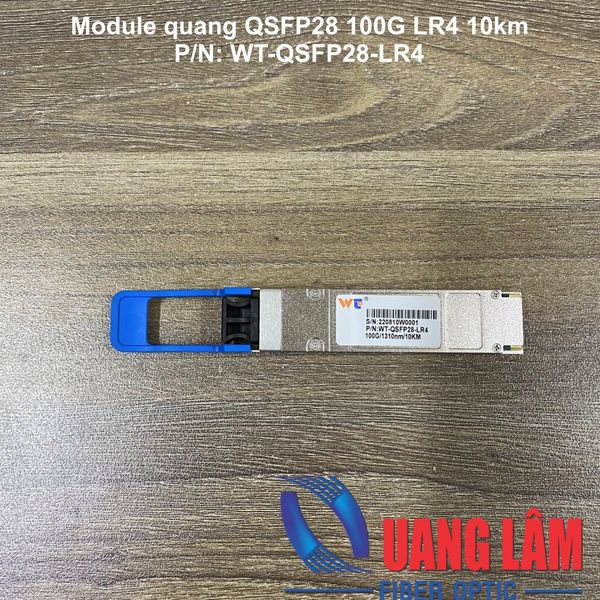 Module quang QSFP28 100G LR4 10km WT-QSFP28-LR4 + Hổ trợ tốc độ 103.1Gb/s + Khoảng cách truyền dẫn lên đến 10km trên đường truyền cáp quang Singlemode (SMF) + Dùng công nghệ laser DFB WDM LAN và PIN receiver + Giao tiếp chuẩn I2c với tính năng DDM (Digital Diagnostic monitoring) + Chuẩn quốc tế QSFP28 MSA với giao diện LC Duplex + Nguồn cung cấp +3.3V + Công suất tiêu thụ tối đa: 4 W + Nhiệt độ hoạt động:0 to +70 °C + Đáp ứng tiêu chuẩn EU Directive 2011/65/EU (RoHS 6/6)