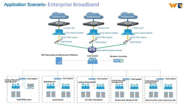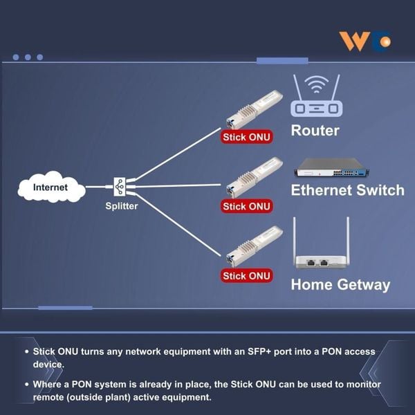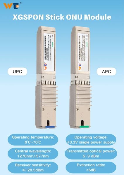The XGS-PON ONU stick transceiver is an Optical Network Terminal (ONT) with Small Form-factor Pluggable (SFP+) packaging. The XGS-PON ONU stick integrates a bi-directional (max 10Gbit/s) optical transceiver function and 2nd layer function. By being plugged into the customer premise equipment (CPE) with standard SFP port directly, the XGS-PON ONU stick provides multi-protocol link to the CPE without requiring separate power Supply.
